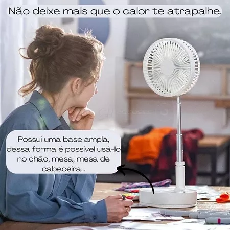Compacto e versátil, este ventilador ajustável é ideal para qualquer ambiente. Seu design retrátil permite ajuste de altura, e a função power bank mantém seus dispositivos carregados. Com operação silenciosa e até 4 velocidades, é perfeito para refrescar com praticidade.
